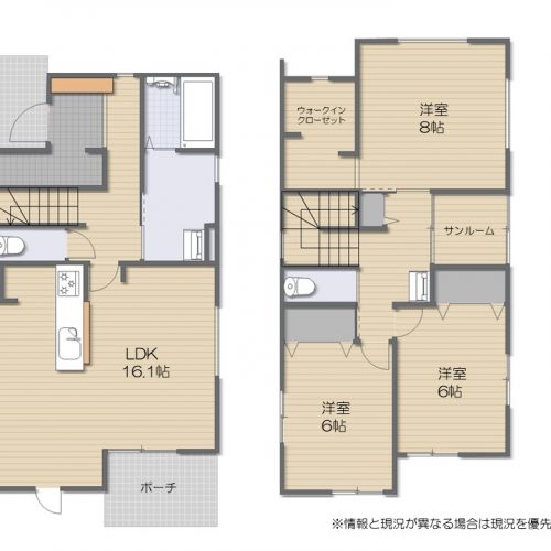 設備:全居室収納、ウォークインクローゼット、太陽光発電システム、エアコン2台以上、シューズインクローゼット、モニター付インターホン、ディンプルキー、室内物干し、上水道、下水道、電気、ウッドデッキ、サンルーム、照明器具、火災警報器(報知機)、インターネット対応、複層ガラス